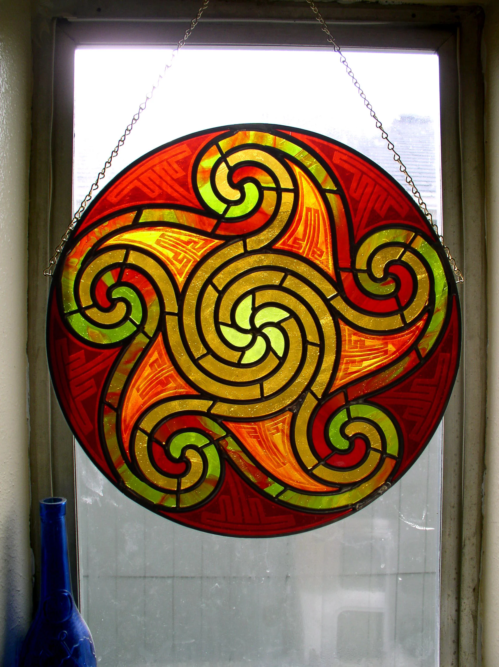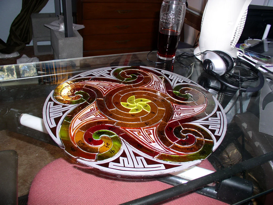 This piece was made for hanging at the Fusions Art Gallery, in Ocean Shores, WA. This is a slightly different take on an older piece of mine, Tine Chnámh, with a much deeper expedition into the world of sandblasting. I should also note that this is the first piece I've completed with my new sandblaster, and it measures 16 ½" in diameter. In the near future I plan on doubling this pattern's size, making it 6 armed (to eliminate the dreaded starfish effect), and etching into the voids the life story of Setanta/Cúchulainn.