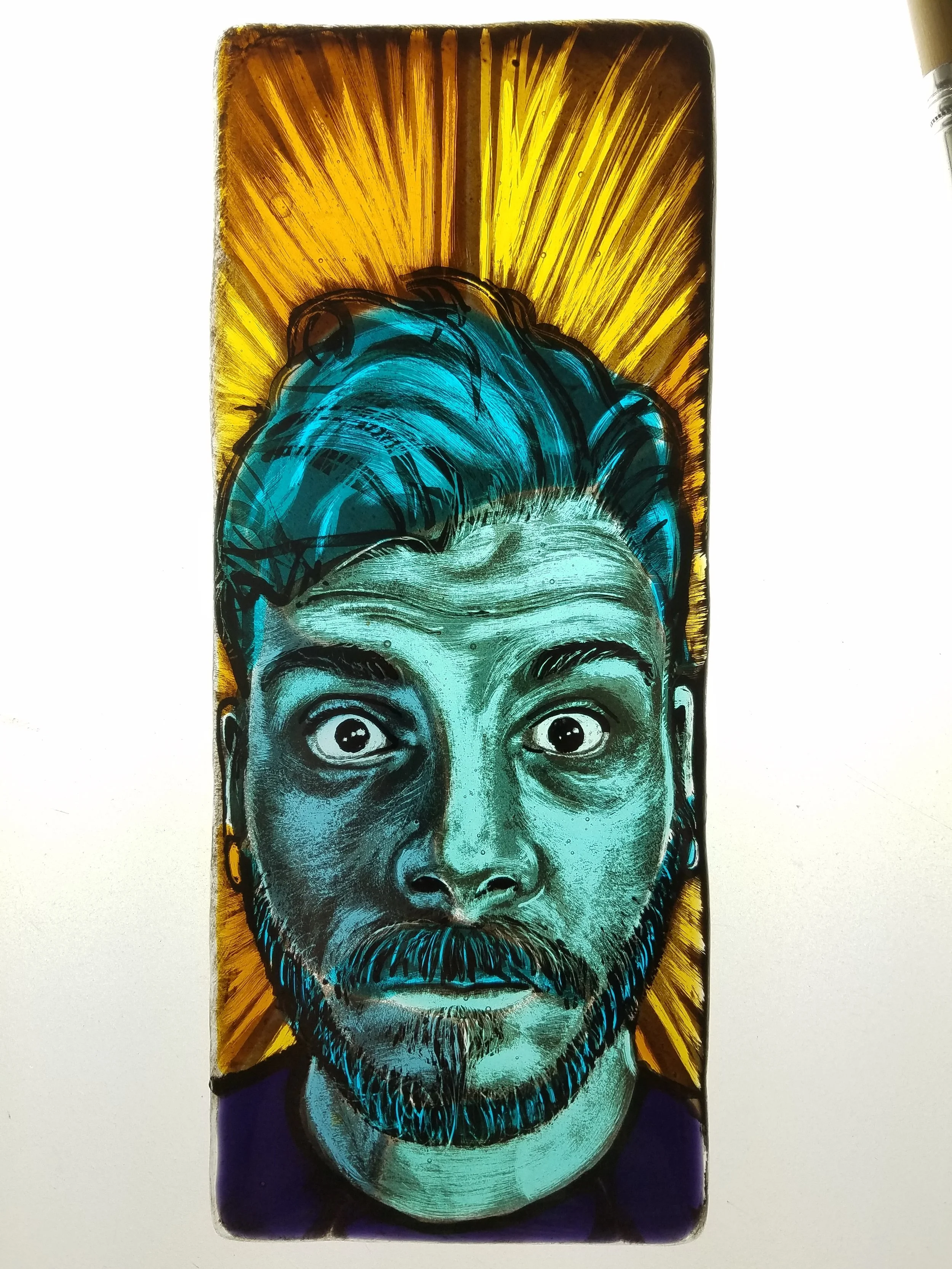 My first full vitri-fusáille self-portrait, after learning the technique from Peter McGrain last summer @ the Uroboros Glass Studio. Beyond even the technique though, it was getting to finally learn the basics of stained glass painting after all these years that sorta hurled me back into the world of creating again. This little portrait is rough and half-made, but I love it for what it represents -- a new path.